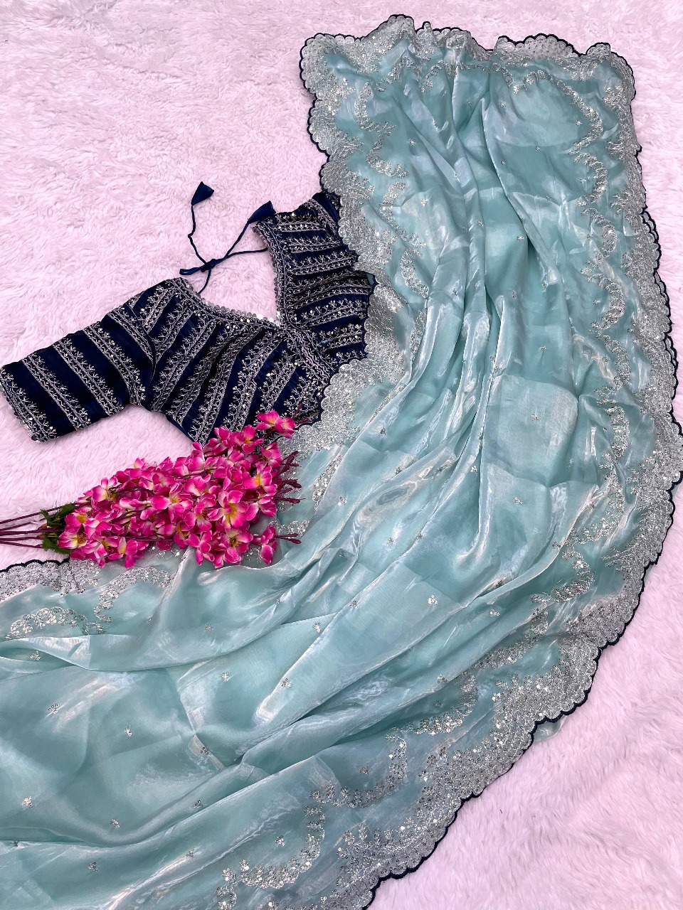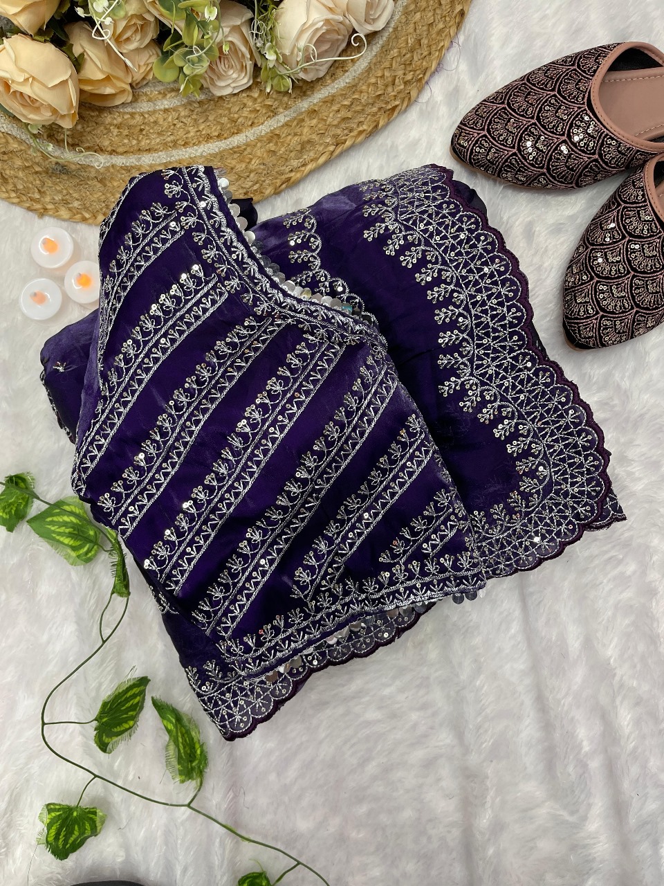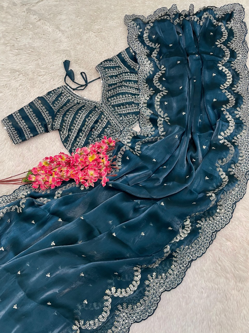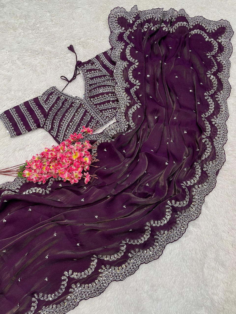 SAREES FABRIC.:-Jimmy choo fabric with Dual colour sequence and thread embroidery work and arc cut border with all over butta work.