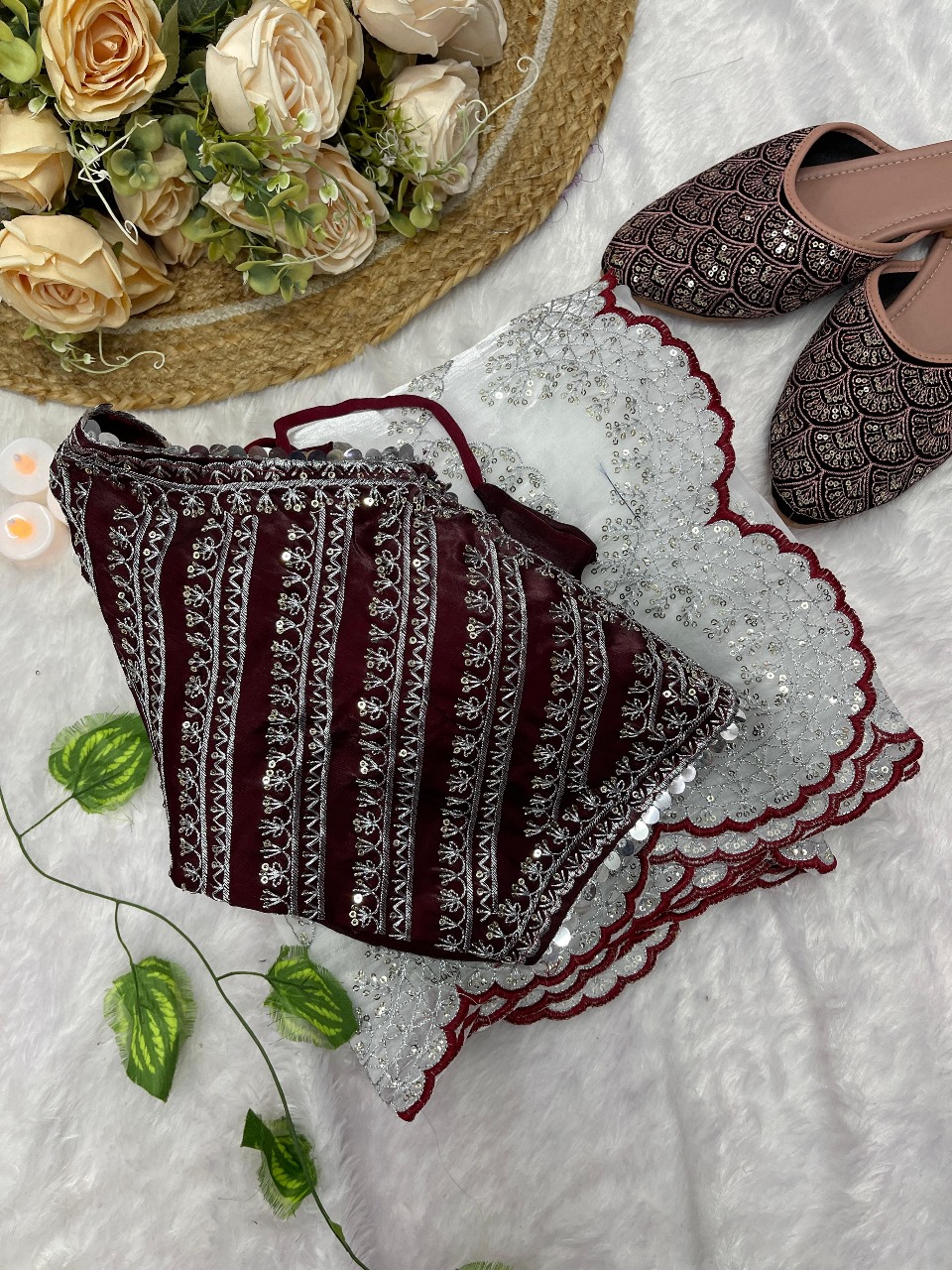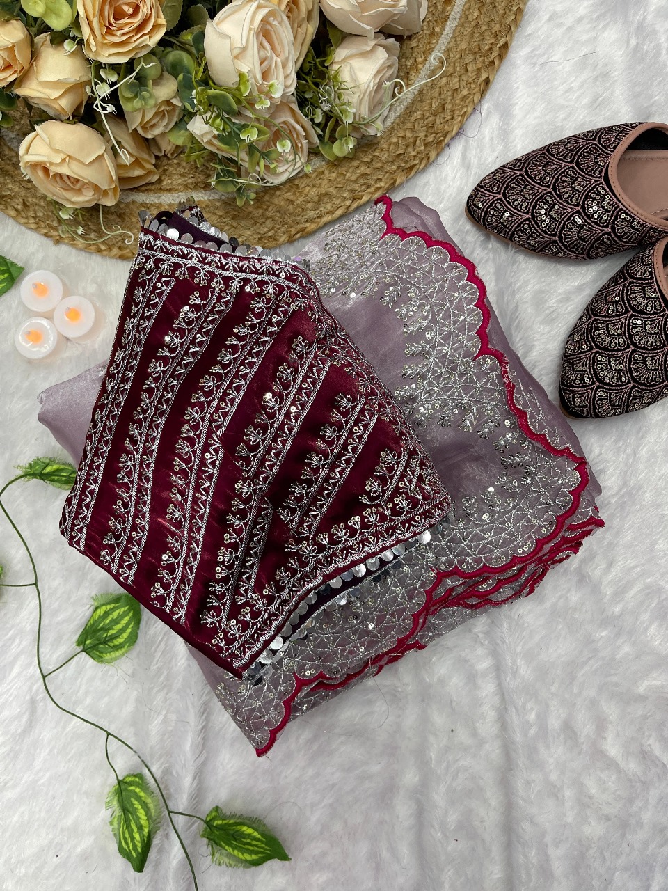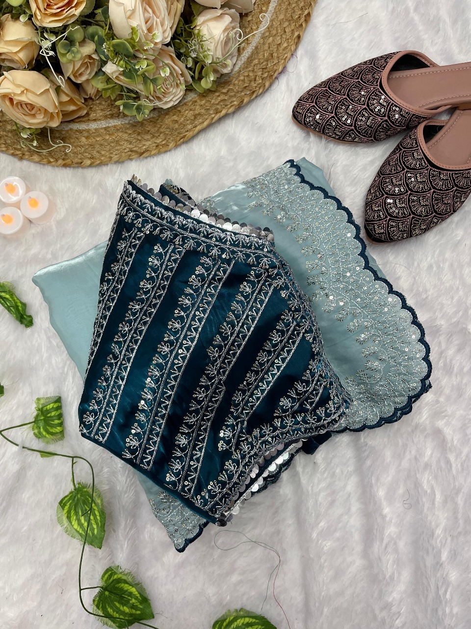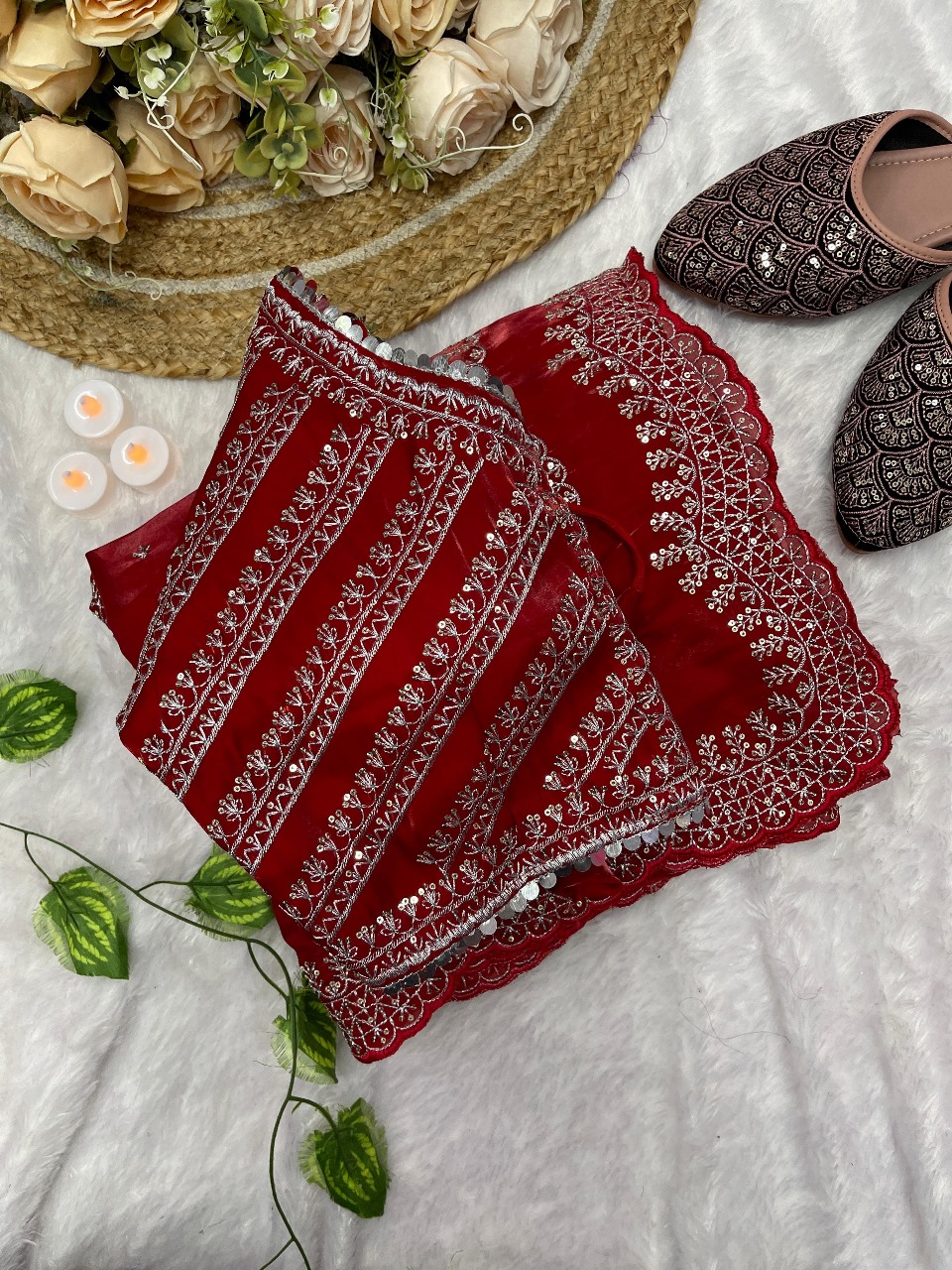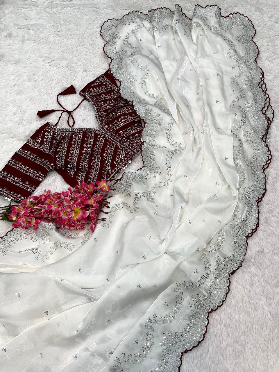 SAREES FABRIC.:-Jimmy choo fabric with Dual colour sequence and thread embroidery work and arc cut border with all over butta work.